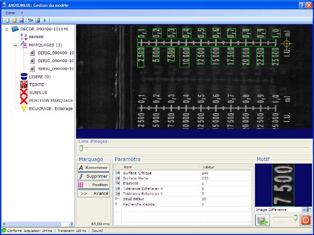 La particularité d’Andromède consiste à décomposer en vecteurs la forme à contrôler, permettant ainsi une inspection très précise et un diagnostic plus fiable. Le système est basé sur des caméras linéaires qui reconstituent une image 2D à partir d’une simple ligne de capteur, l’application détermine ensuite le degré de corrélation entre le modèle vectoriel et les marquages réels. Le produit sera accepté ou rejeté selon les tolérances que vous aurez prédéfinies.